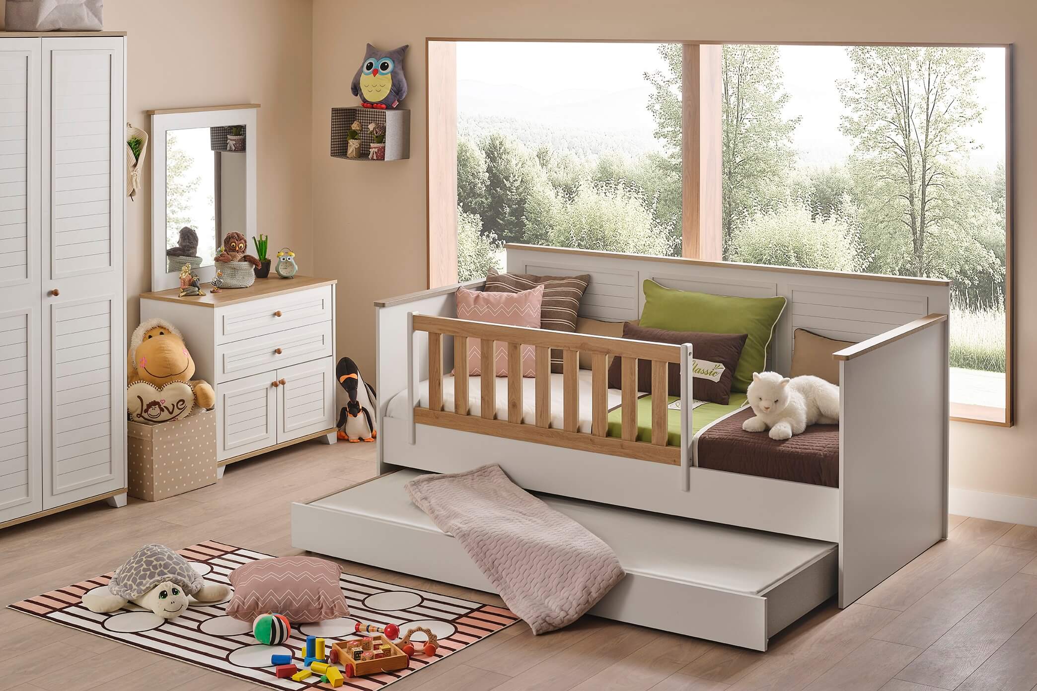 Bariera de protecție din colecția Nova este concepută pentru a asigura un somn liniștit și sigur copiilor. Se montează ușor pe laterala patului Toddler Nova, prevenind căderile în timpul nopții.