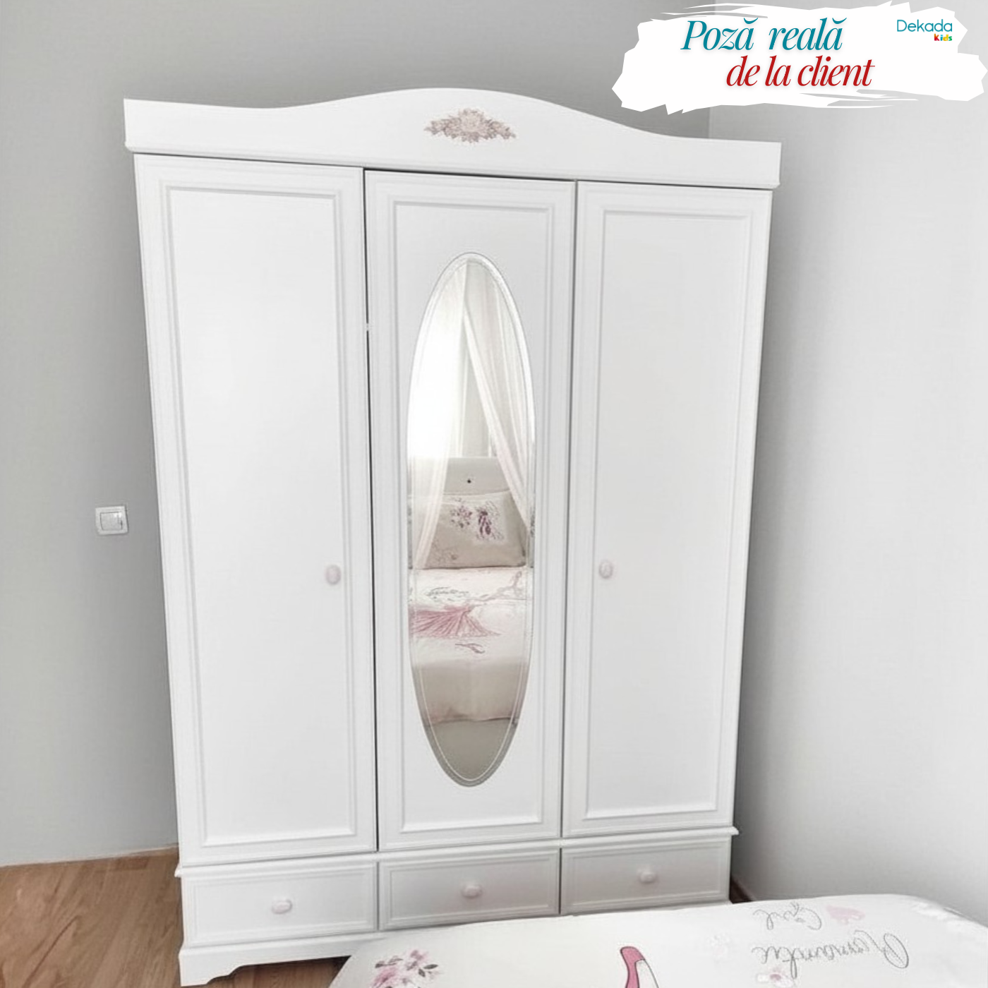 Dulapul cu 3 usi si oglinda din Colectia Rustic White este atat elegant, cat si practic, reprezentand alegerea perfecta pentru a completa decorul cu stil al camerei de copii.