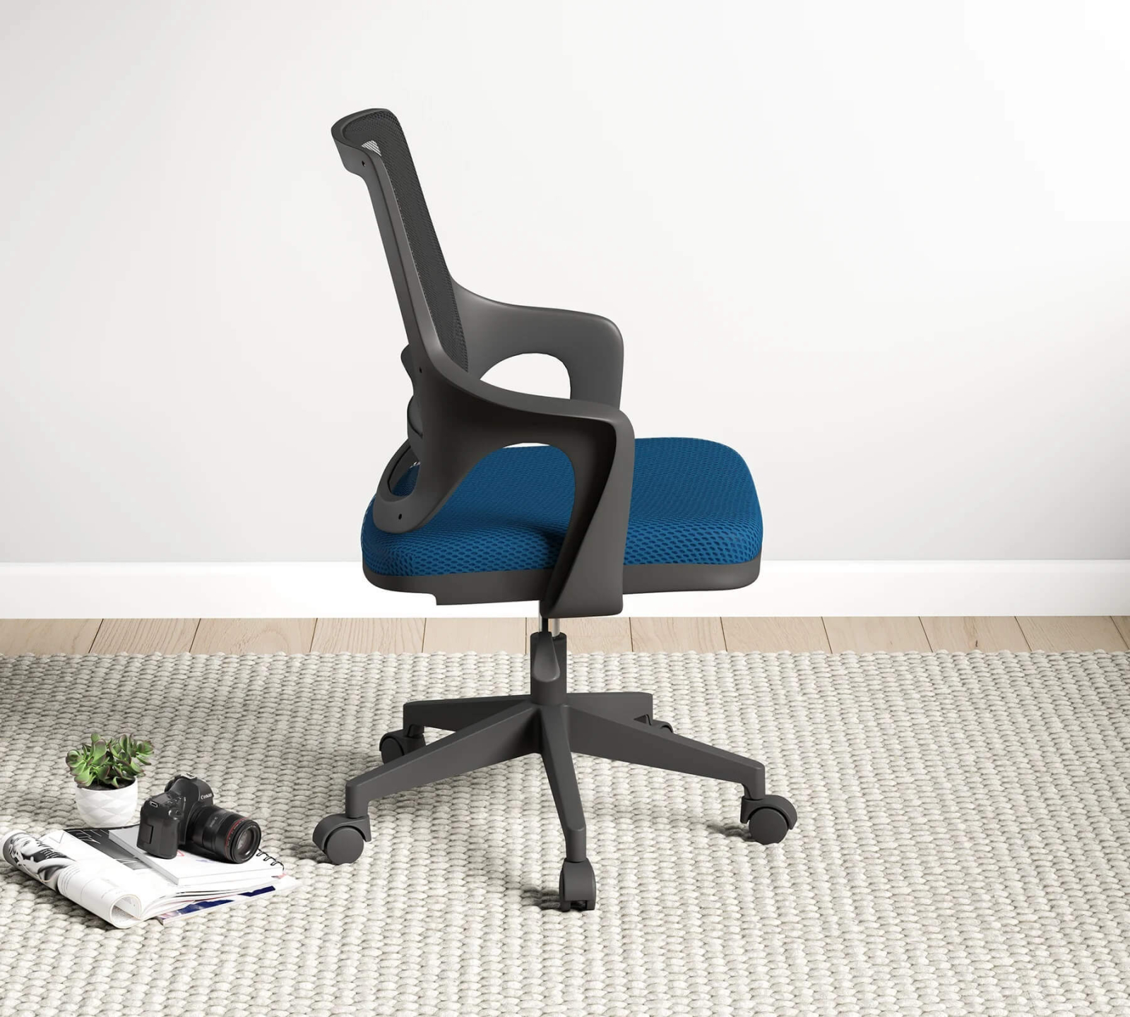 Scaunul Flex este creat special pentru camera copiilor și adolescenților, combinând confortul unui scaun de relaxare cu funcționalitatea unui scaun de birou. Șezutul moale, tapițat cu material textil într-o nuanță plăcută de albastru, și spătarul din plasă gri deschis asigură confort și ventilație optimă chiar și în timpul utilizării îndelungate.