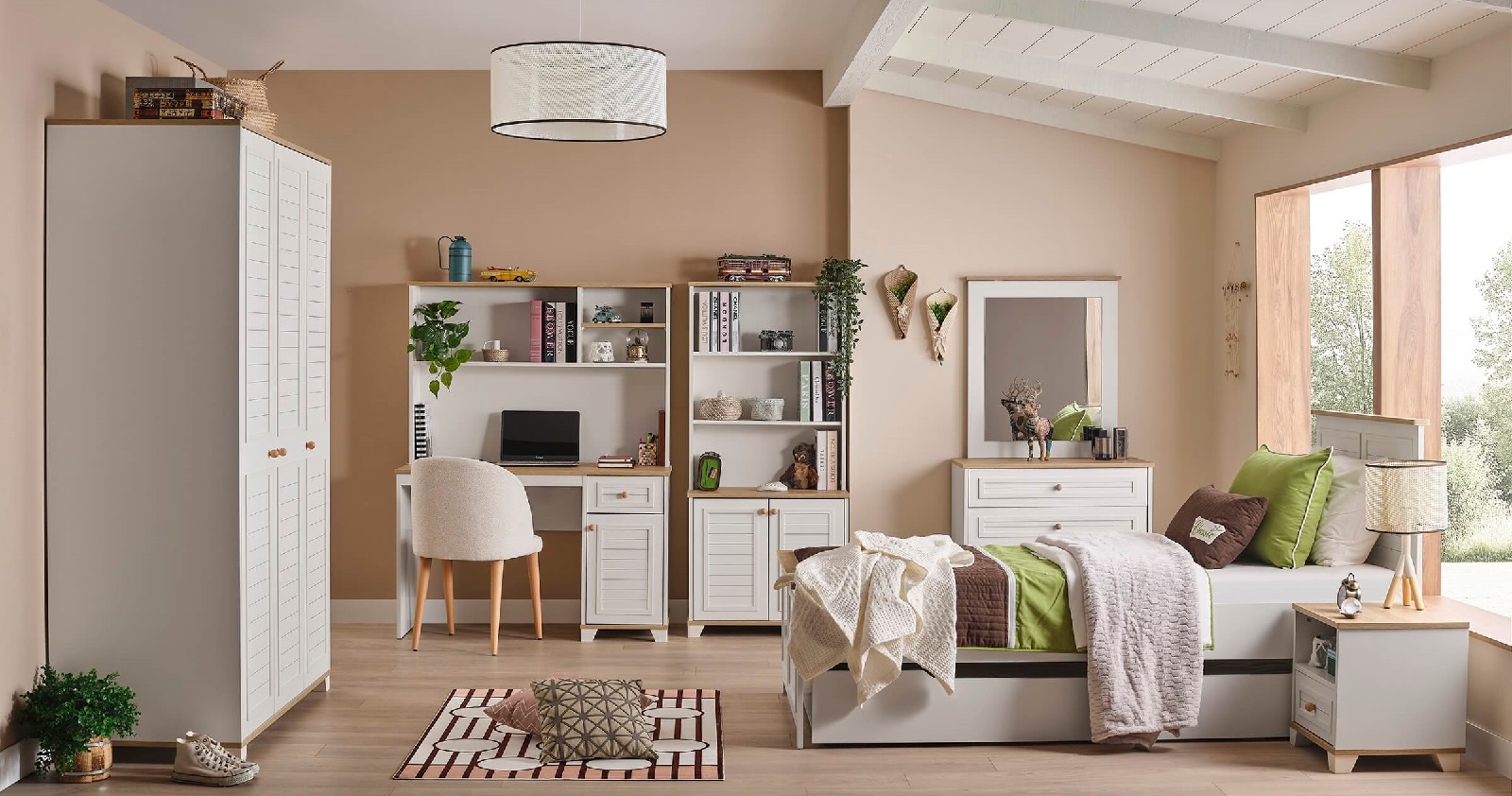 Biroul pentru studiu din colecția Nova este creat special pentru a oferi copiilor un loc confortabil și organizat pentru învățare. Designul său modern, în nuanțe de alb și lemn natural, aduce echilibru și luminozitate în camera copilului.