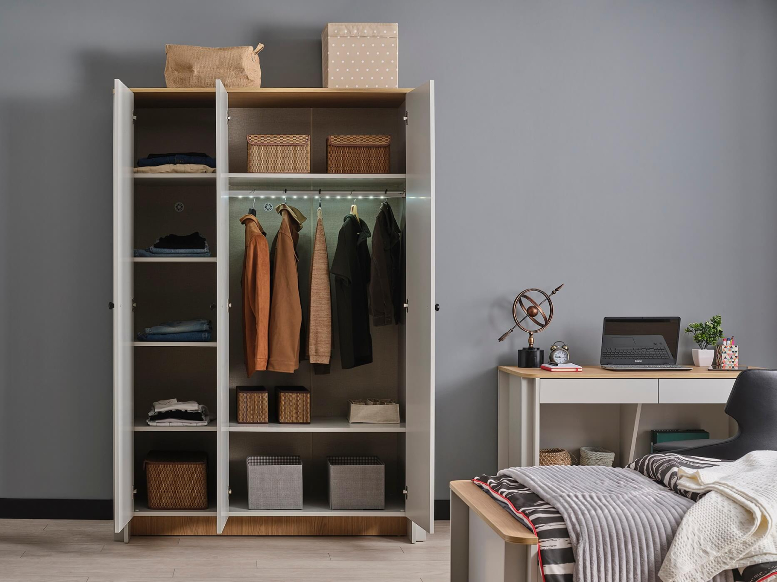 Iluminat LED: Vizibilitate imbunatatita in interiorul dulapului.
