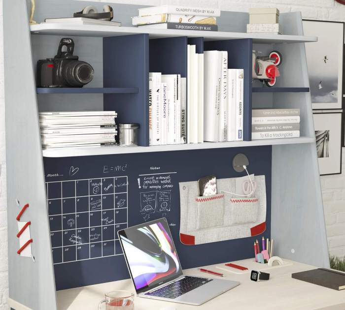 Unitatea de birou Trio se remarca prin sistemul de rafturi care adauga profunzime spatiului de lucru, permitand o organizare eficienta a materialelor necesare studiului. Umerasele elastice de pe laterale sunt solutii practice pentru depozitarea accesoriilor precum fotografii, ochelari si brelocuri. Totodata, buzunarele din material textil mentin ordonata suprafata biroului, oferind un loc sigur pentru obiectele mici. Aceste caracteristici functionale se asorteaza perfect cu schema de culori dinamica albastru-bleumarin a Colectiei Trio, adaugand o nota estetica spatiului.