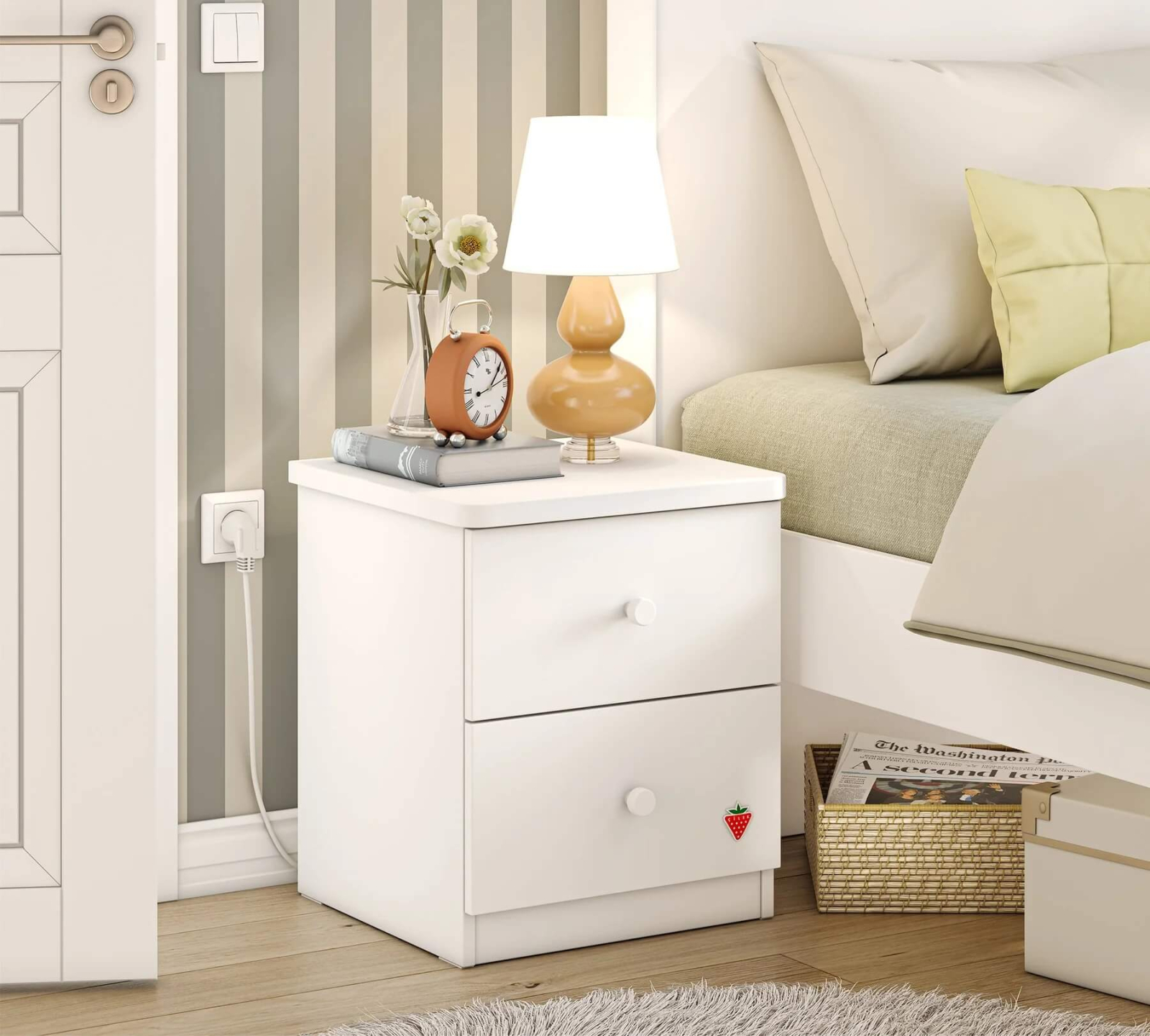 Aceasta noptiera din colectia Varia White aduce un plus de functionalitate si eleganta in camera copilului dumneavoastra. Cu un design simplu si o finisare in alb lapte, piesa imbina perfect stilul cu practicitatea, fiind potrivita atat pentru familii, cat si pentru afaceri mici. Avand dimensiuni compacte - latime: 43 cm, inaltime: 50 cm, adancime: 42 cm - noptiera se integreaza usor in orice spatiu.