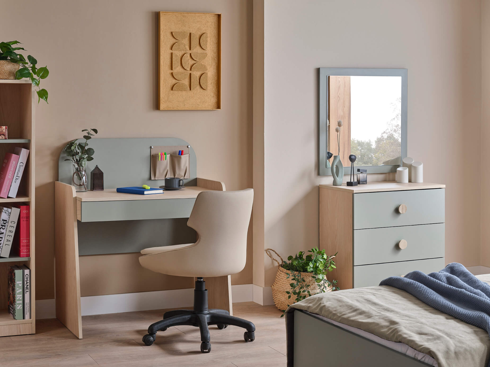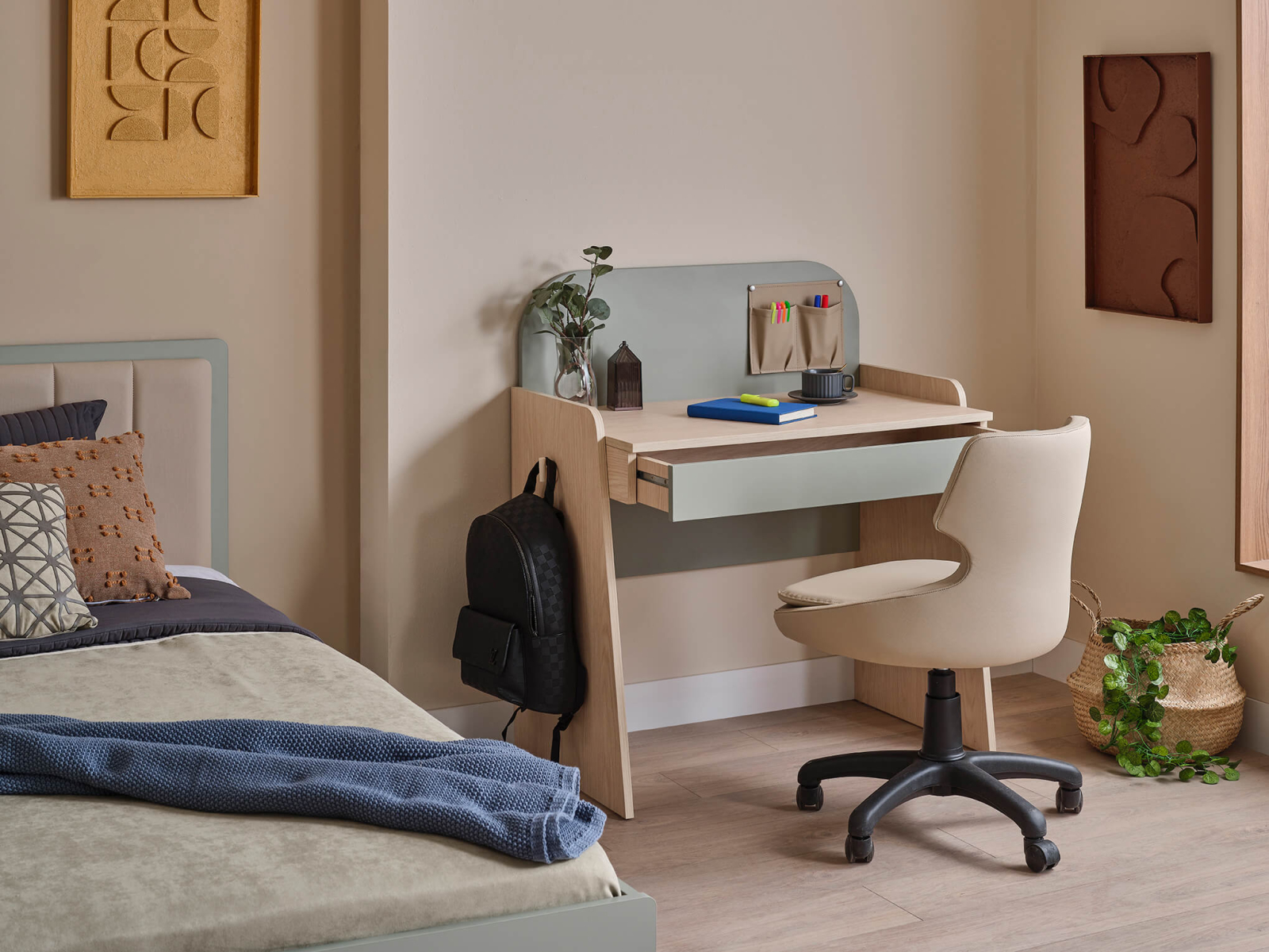 Biroul din colectia Mono nu doar completeaza estetica camerei copilului, dar si faciliteaza un mediu de invatare eficient. Designul sau modern si functional incurajeaza organizarea si concentrarea, elemente esentiale pentru succesul academic. Oferind un spatiu clar delimitat pentru studiu, biroul ajuta copiii sa isi dezvolte obiceiuri de invatare sanatoase si organizate, contribuind astfel la formarea unei rutine zilnice benefice pe termen lung.