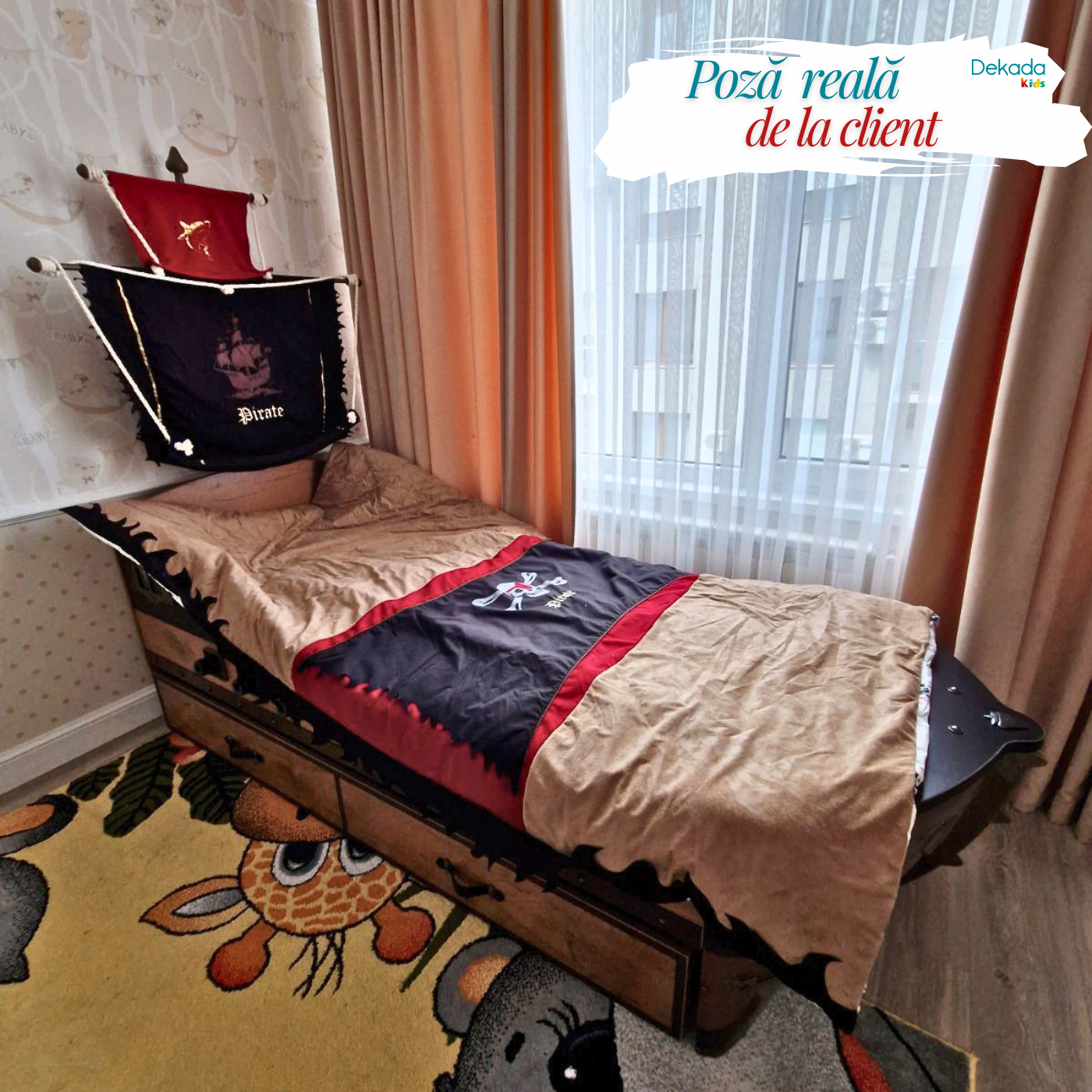 Patul Corabia Piratilor aduce aventurile maritime direct in dormitorul copilului tau, transformandu-l intr-un spatiu plin de distractie si imaginatie. Construit din materiale rezistente, acest pat de 90x190 cm impresioneaza prin detaliile sale captivante cu corabii piratate, oferind un mediu de dormit confortabil si sigur datorita colturilor rotunjite. Cu o capacitate maxima de greutate de 130 kg, asigura o durabilitate excelenta, fiind ideal pentru utilizarea indelungata.